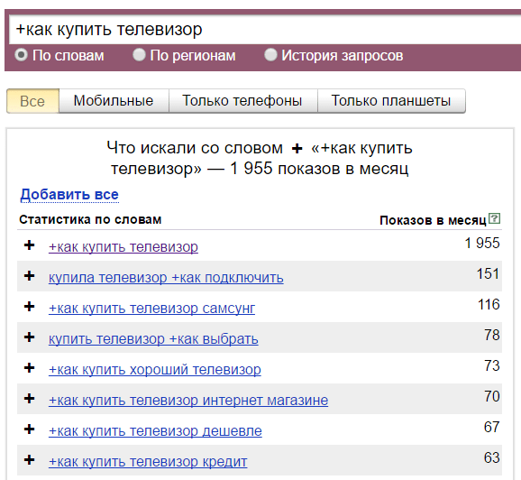 Плюс. Символ «+» принудительно учитывает стоп-слова. По умолчанию Вордстат не учитывает предлоги, и по запросу «как купить телевизор» покажет вам в основном коммерческие запросы: